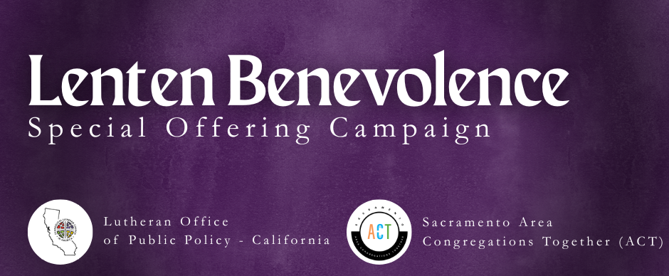 This year, the St. John's community will center our Lenten Benevolence around two timely and important organizations - Sacramento Area Congregations Together (ACT) and the Lutheran Office of Public Policy (LOPP) - California. Throughout the five weeks in Lent, we invite you to prayerfully consider deepening your understanding of and relationship with these partner organizations. We'll provide opportunities on Sunday mornings to connect with leaders of both Sacramento ACT and LOPP-CA and welcome you to give a special offering to either or both of these organizations.